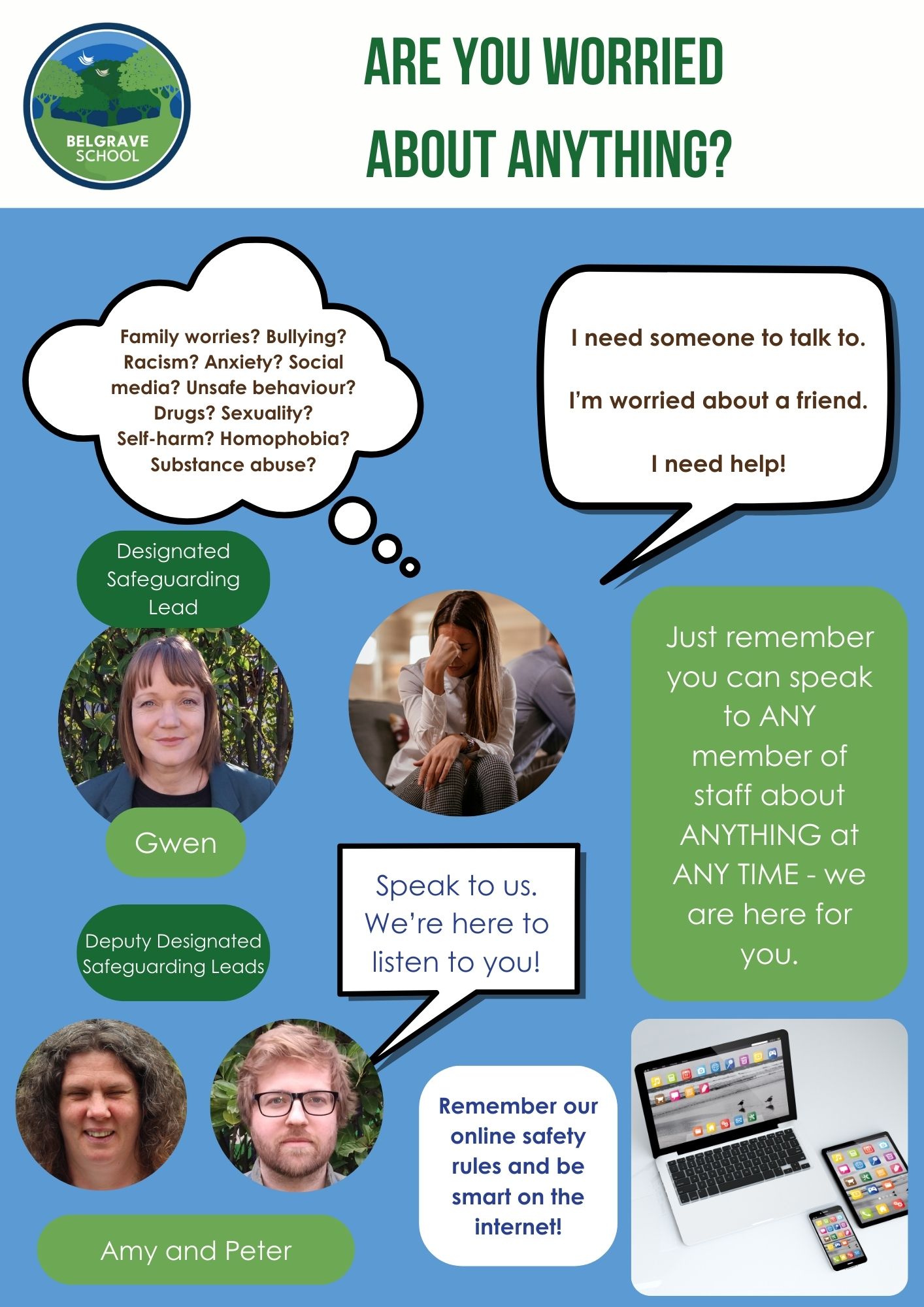 • You can talk to any adult in the school about anything. Do not keep your concerns to yourself; nothing is too small or too big.